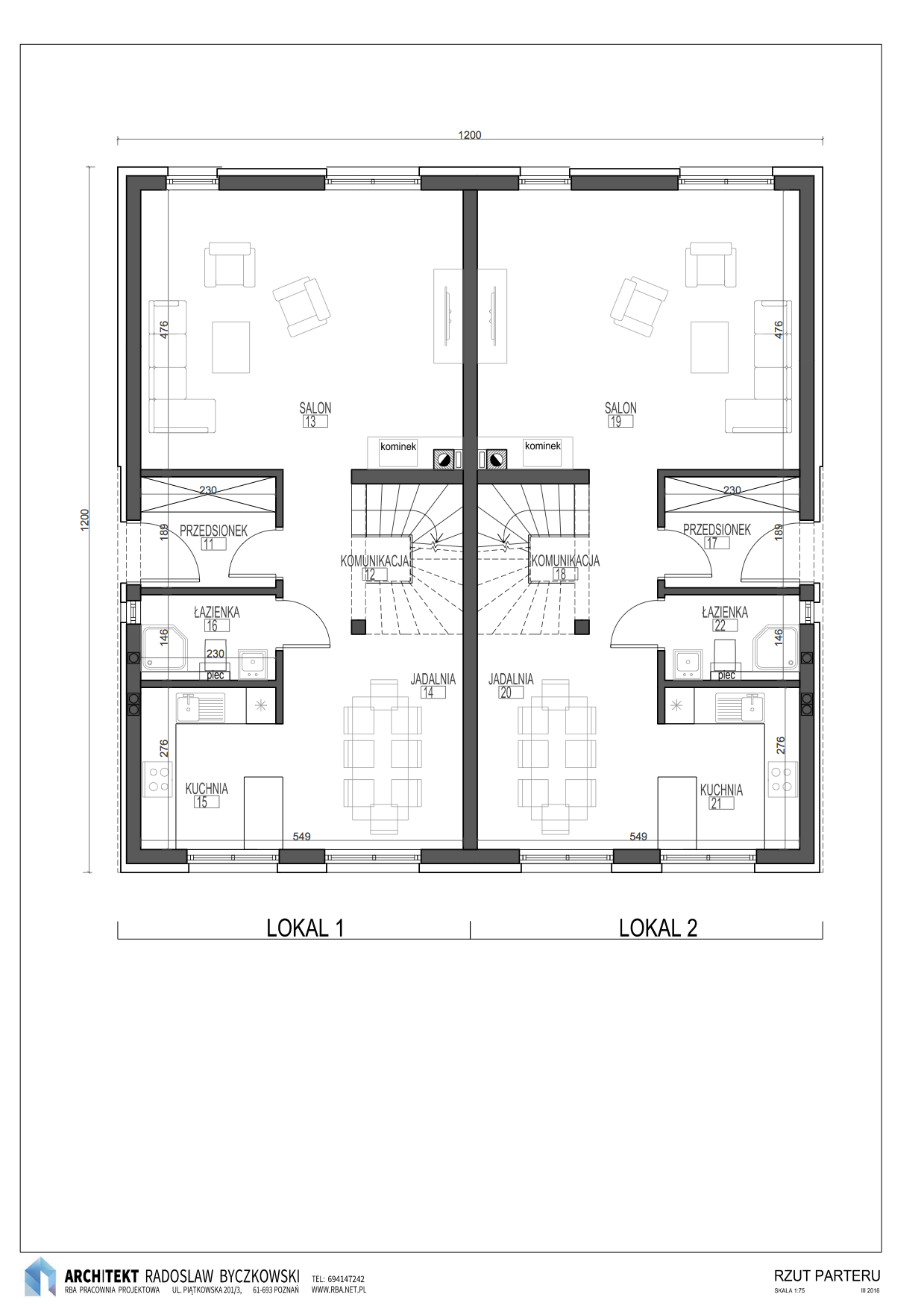 Parter każdego lokalu składa się z przestronnego salonu z przygotowanym miejscem na kominek oraz bardzo ustawnej kuchni z dużą jadalnią, łazienki (z miejscem na prysznic), przedsionka wejściowego z miejscem na szafę oraz holu. Na piętrze mamy trzy obszerne sypialnie - największa z możliwością zabudowy garderobą, łazienkę oraz korytarz - komunikację z wejściem na duży stryszek (ok. 28m2). Lokale mają powierzchnie113 m2 z lewej strony i 115m2 z prawej strony budynku. Ponadto do każdego domu przylega ogród o powierzchni ok 380m2.