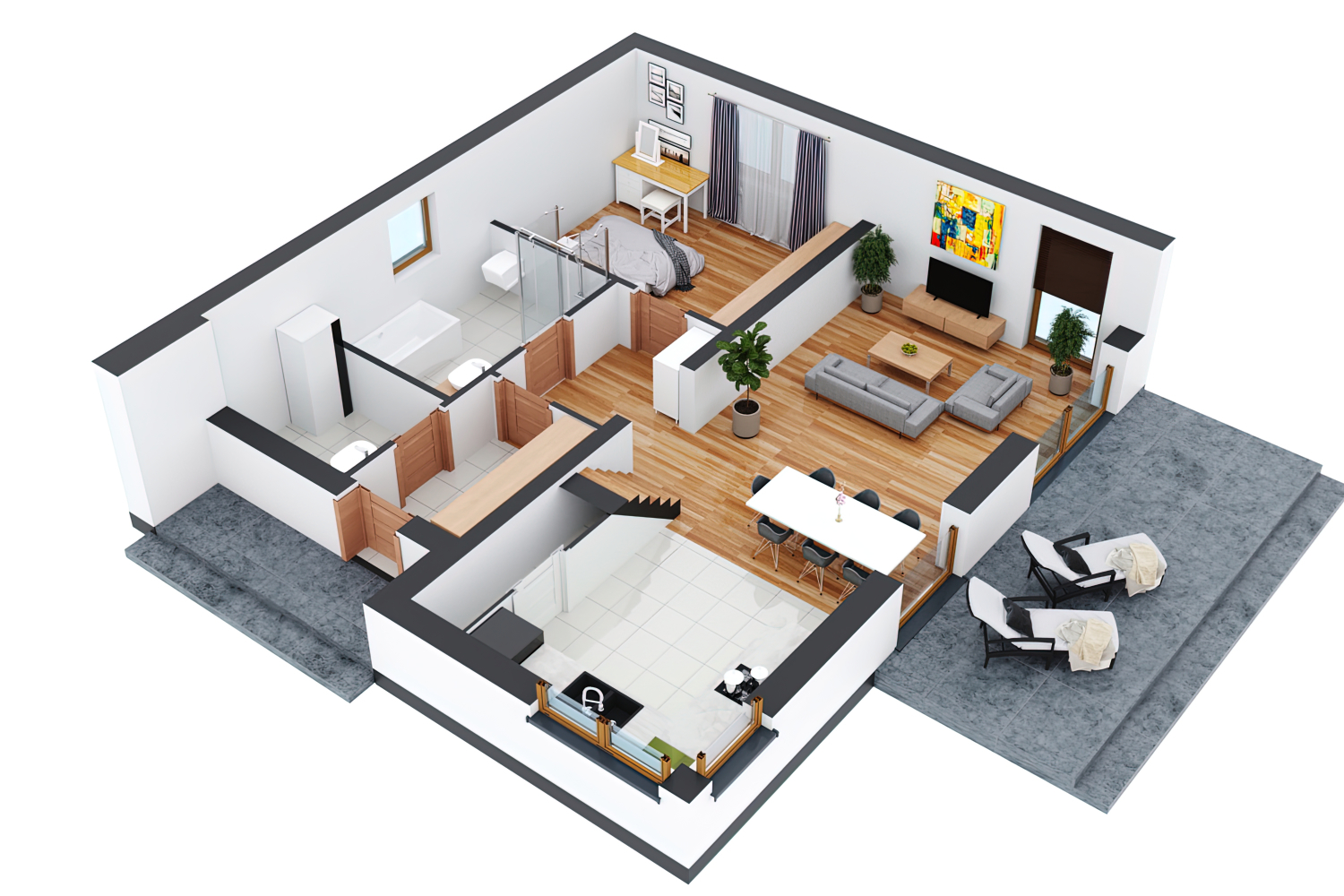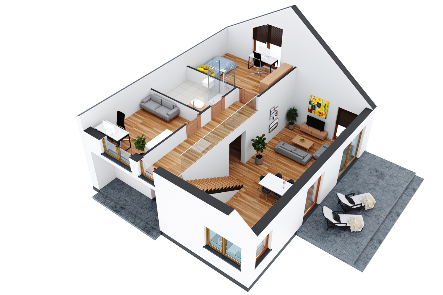 Na parterze szerokie wejście z dużą garderobą, kotłowania, łazienka, przestronny pokój sypialny, świetnie doświetlony salon, kuchnia oraz jadalnia. Na piętrze kolejna łazienka oraz dwa pokoje sypialnie/gabinet. Nad przestrzenią salonową wysoka, otwarta przestrzeń.