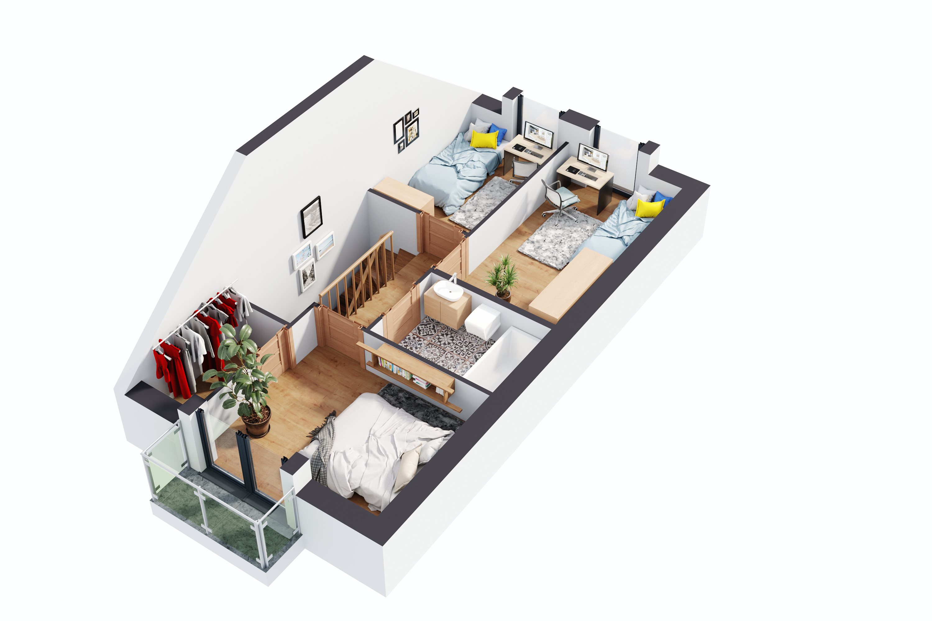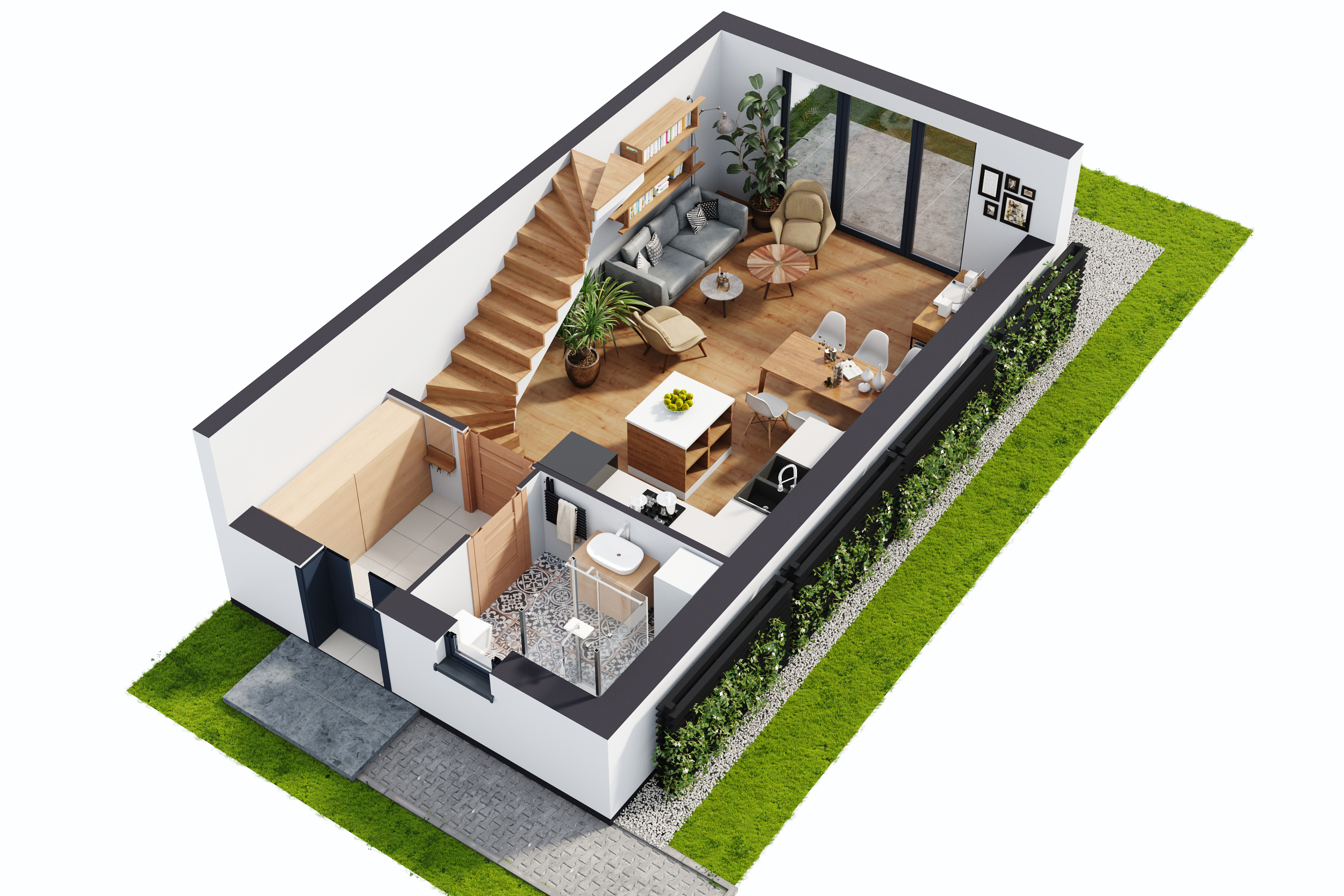 Dom wygodnie podzielony jest na dwie strefy: dzienną na parterze i nocną na piętrze. Każdy lokal o powierzchni użytkowej ok 80 metrów ma do dyspozycji ponad 213 metrów ogrodu. Zakończenie budowy: I kwartał 2023.